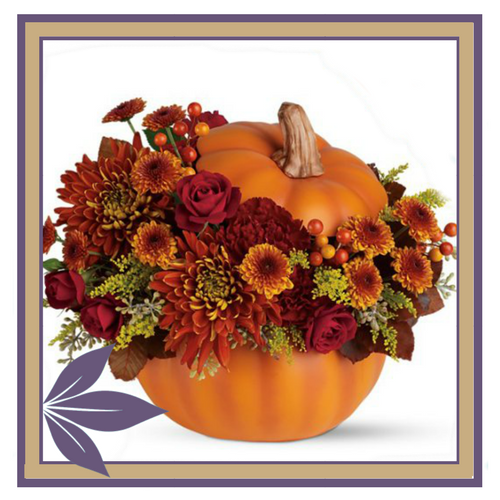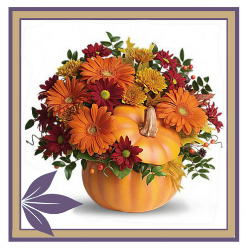 Built in a ceramic pumpkin, this arrangement is filled with bright colorful flowers and accented with rustic natural elements & berries.