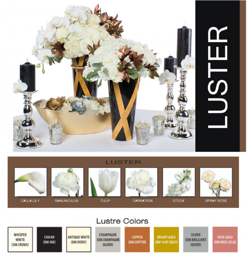 Combined with pure white flower combinations, colors or mercury, clear glass and high sheen vessels, the theme of Luster only brings life to seasonal decorations. When sensitively accented with dusky pink, there emerges a delicate, almost feminine and romantic composition.