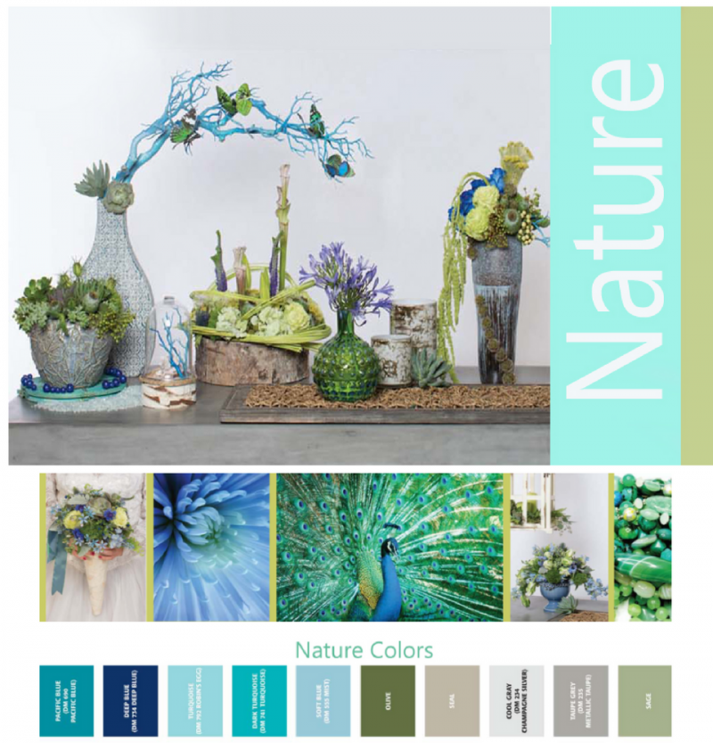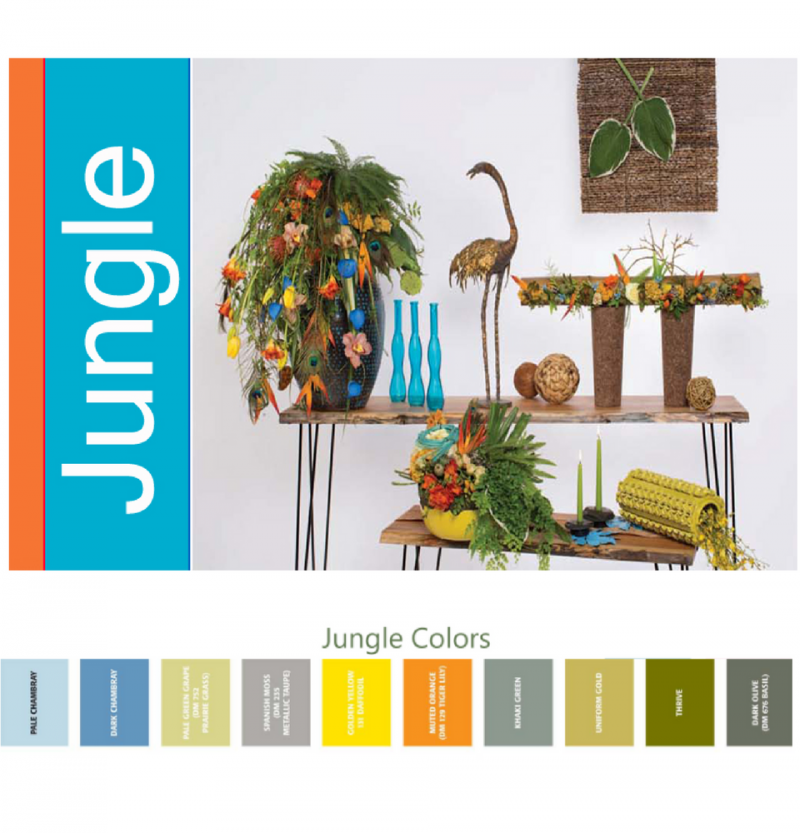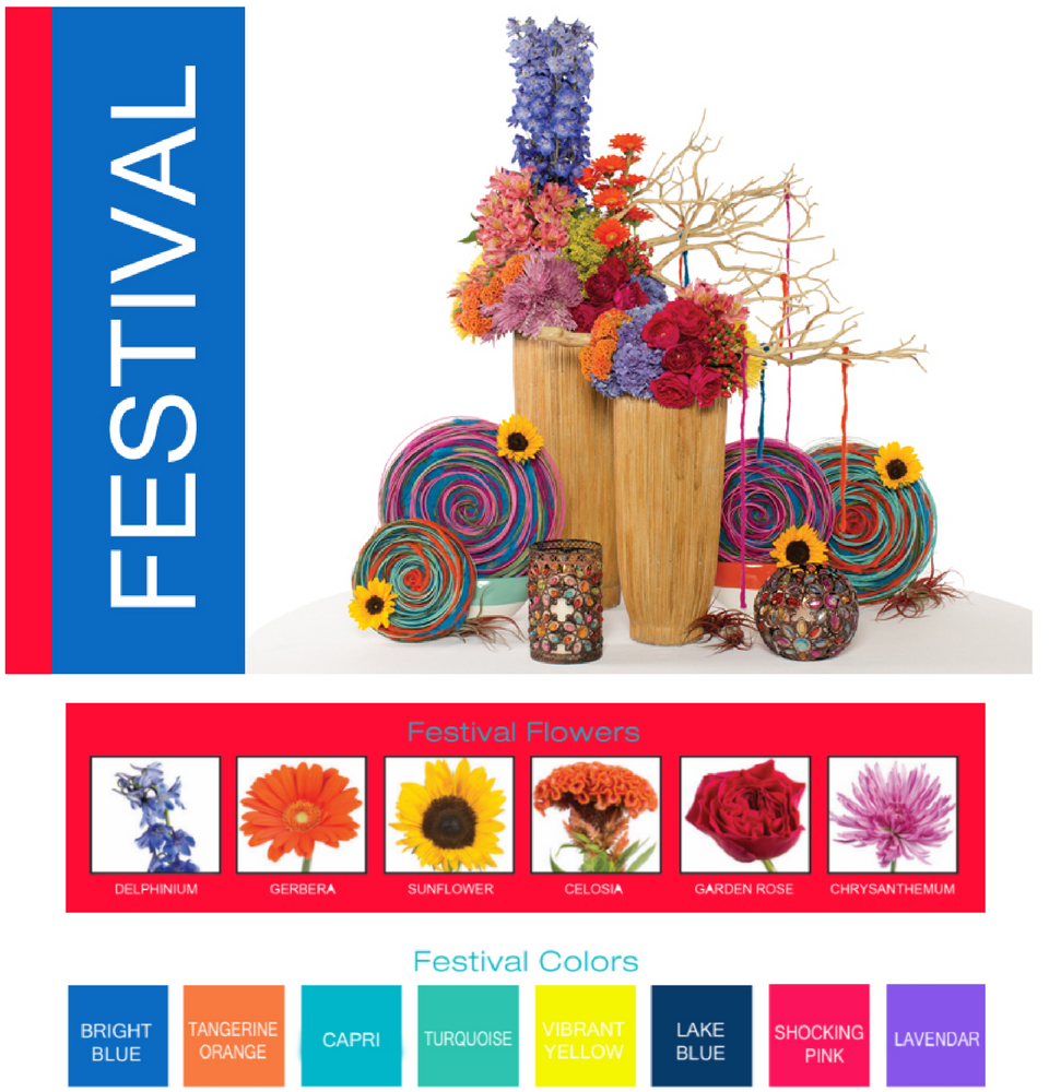 Festive is born of hot, bright, intense colors inspired by hand crafts, fabrics and beads; unusual and quirky tones are clearly apparent in this style. There is extravagant use of fur, feathers, yarns as well as bohemian animal motifs. Festive vessels are made of wood, pottery, tinted glass, and brightly painted ceramics filled with loose organic flower arrangements.