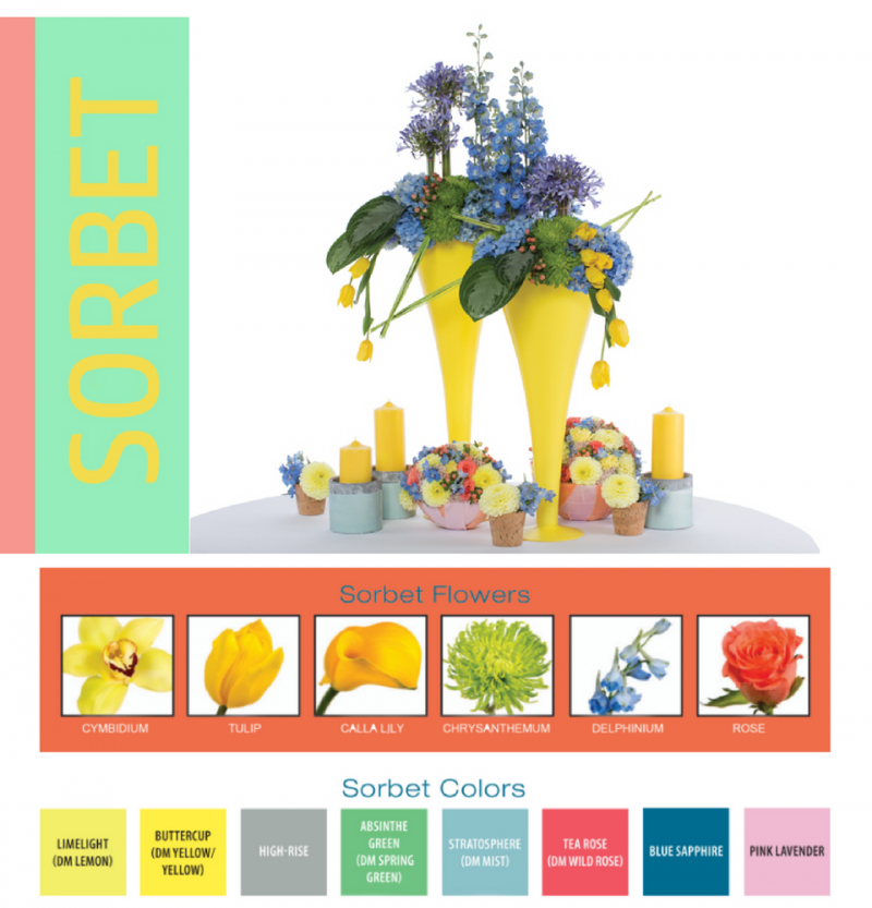 Its sweet colors and geometric accents are polished and refined. Sorbet is a combination of pastels and brights. The style is young and fresh with a nod to mid-century modern style. The Sorbet bride loves bright and sassy and combines colors brilliantly to tell the story of her event.