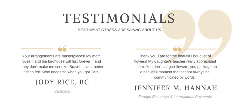 Tara does not disappoint! If you are seeking speedy, exceptional service from someone that understands exactly what you are looking for in a lovely floral arrangement, Tara is that person. I highly recommend her. Thank you for the great service !